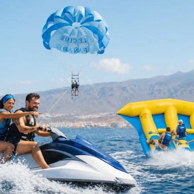 Parascending or parasailing consists of gliding over the ocean while being gently towed by a boat. Like a kite, the sail and the boat’s speed generate the lift necessary to make you fly up to 50 meters above the water. Parascending is a unique, relaxing activity at sea suitable for kids and grownups. Embark on a modern speedboat and then enjoy gliding above the ocean while you admire the gorgeous natural surroundings from the sky! The excursion lasts approximately 45 minutes, including the briefing, a short boat ride and the flight. The flight time is 10 minutes.