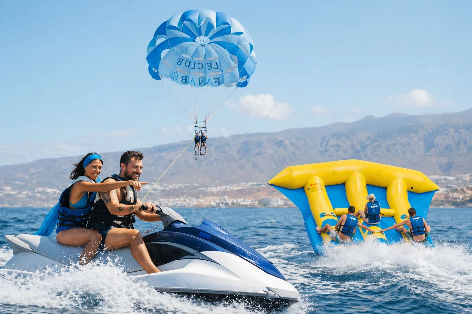 - SPECIAL PACK WATERSPORTS = 20 min Jet Ski Circuit + 10 min Parascending + 10 min Fly Fish